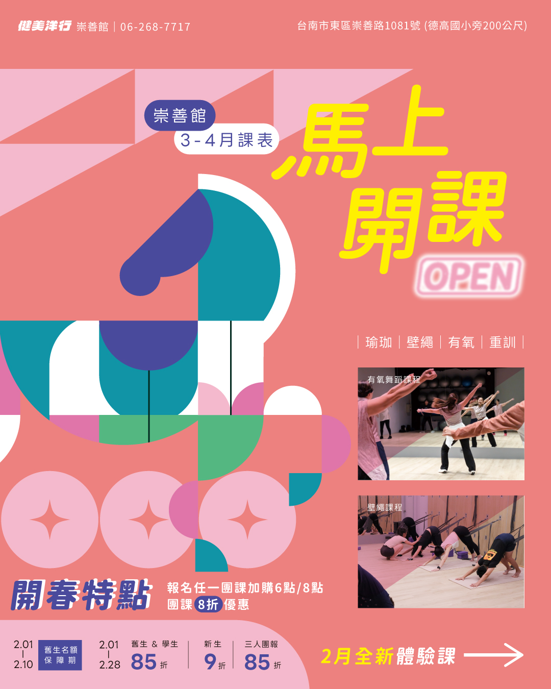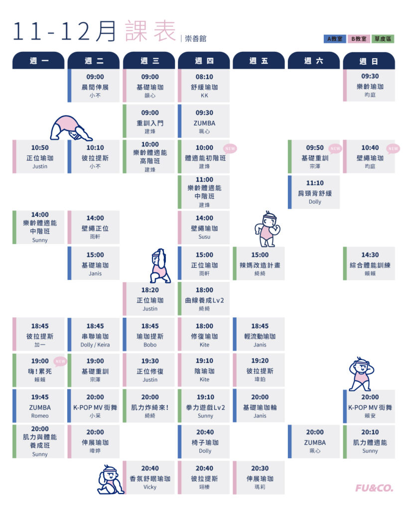 多樣化的課程內容與各專業師資,是想要培養運動習慣的好選擇。團體課程共有「有氧、瑜珈、飛輪」3種課程類型。