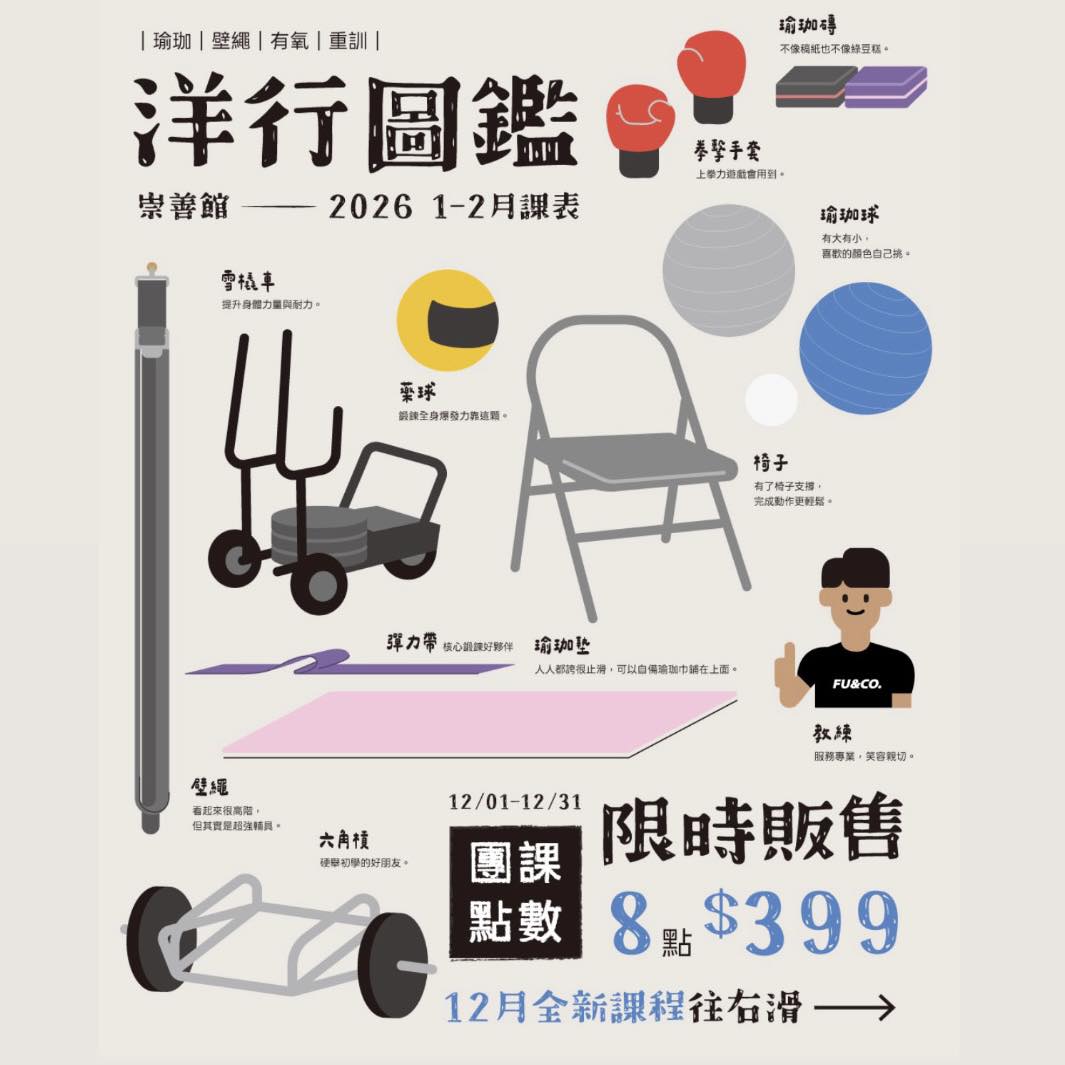 多樣化的課程內容與各專業師資,是想要培養運動習慣的好選擇。團體課程共有「有氧、瑜珈、飛輪」3種課程類型。